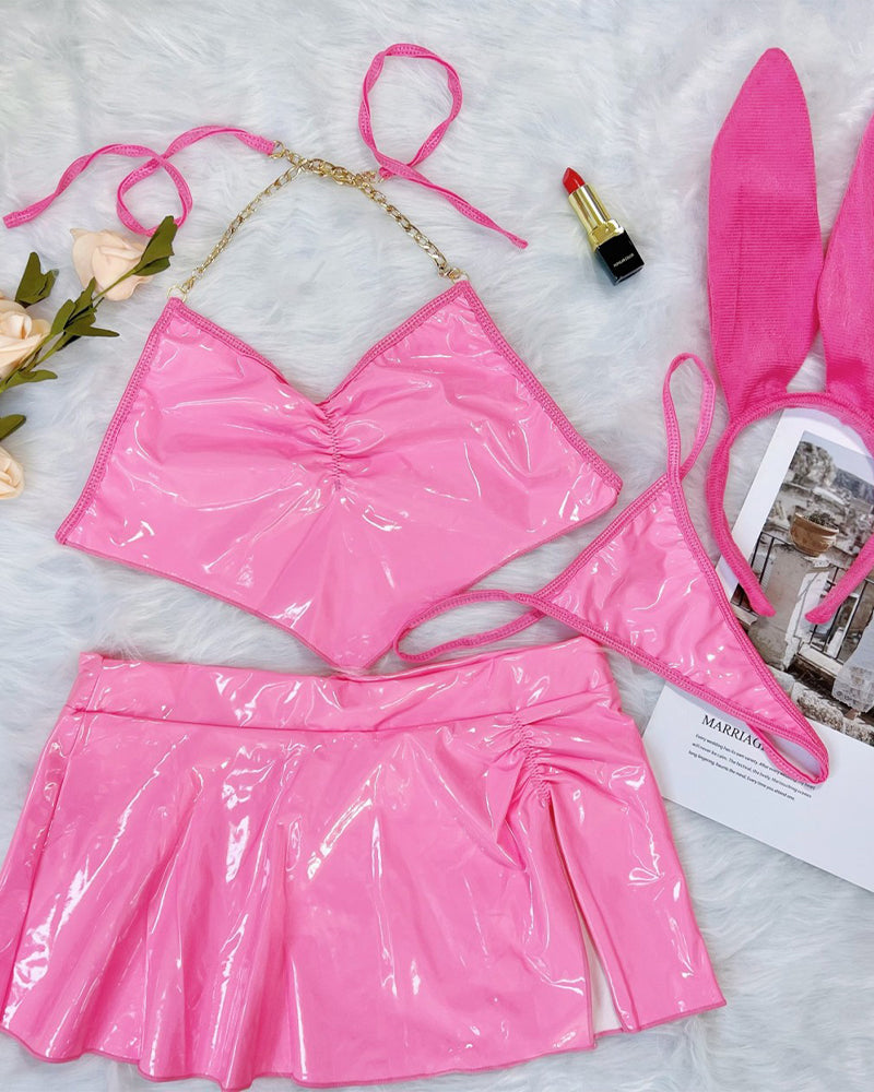 Cute bunny ear design,sexy heart neck backless tank top and mini skirts g-string sets make you look more lovely and charming.